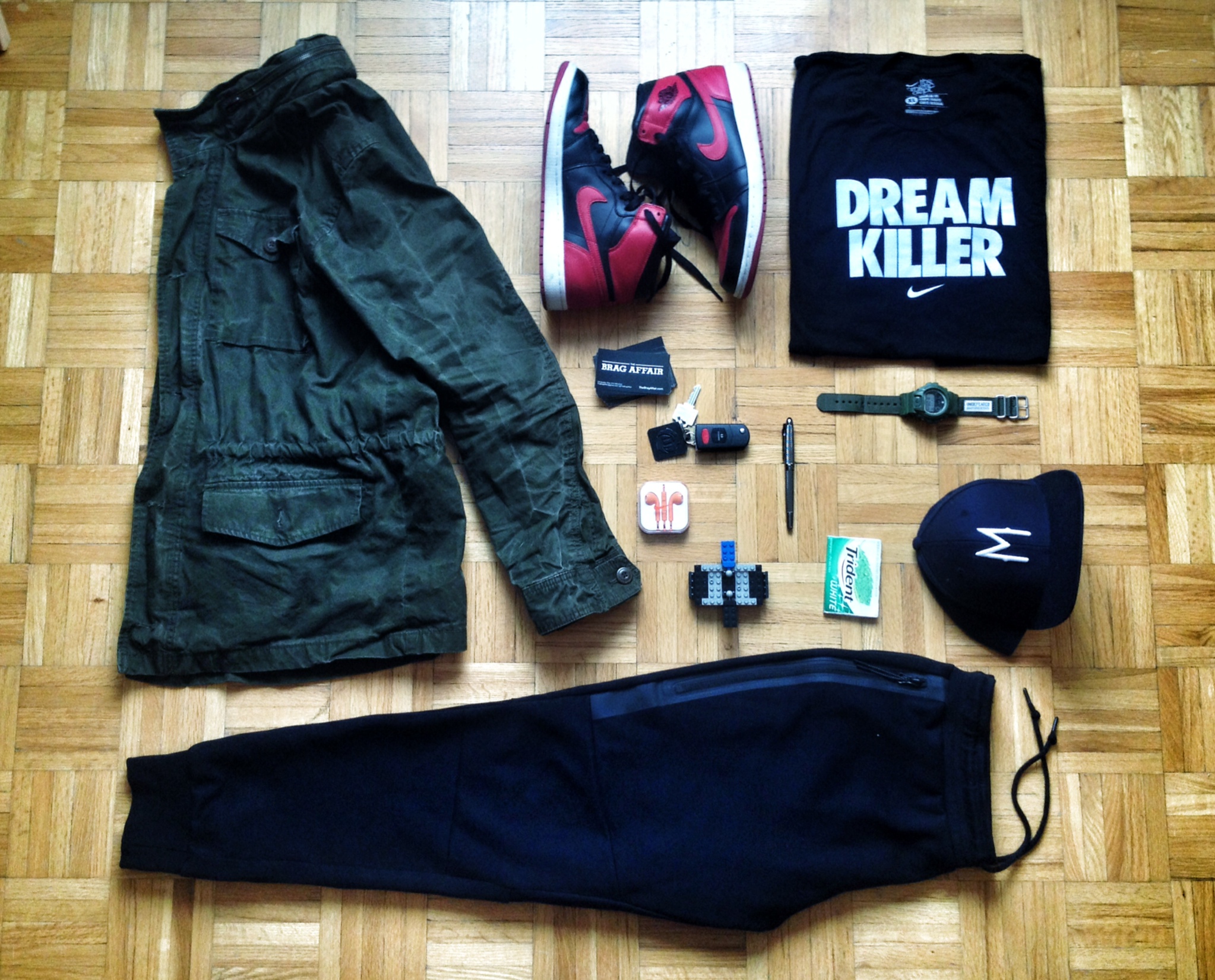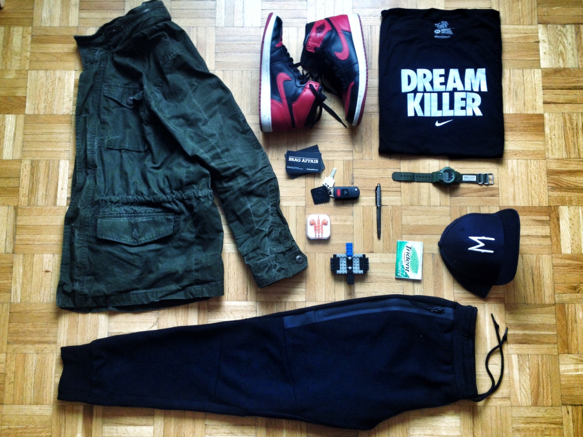 It happened one morning when I had to run a quick errand. Time and the pillow imprint on the right side of my face were working against me, so what-to-wear was decided by the reach of my arm and the items’ proximity to the front door. After making sure I had my wallet, keys and phone I stepped out in my Bred 1s, black tech fleece joggers, the t-shirt I wore to bed the previous night, and an army green jacket my bud had found for me for the awesome price of 8$. I buttoned the jacket to its top button, so it looked like I knew what I was doing and BAM… Instant weekender fit.