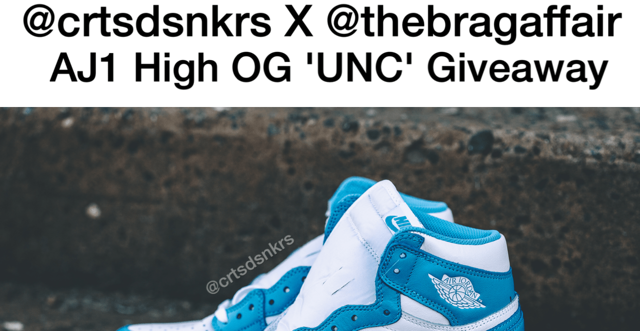 Fortunately for all our supporters, we are enthusiastically teaming up once again with Courtside Sneakers to giveaway one pair of Jordan 1 High UNC coupled with a Courtside Sneakers hoodie and tshirt, as well as a TheBragAffair tshirt for an awesome prize pack.