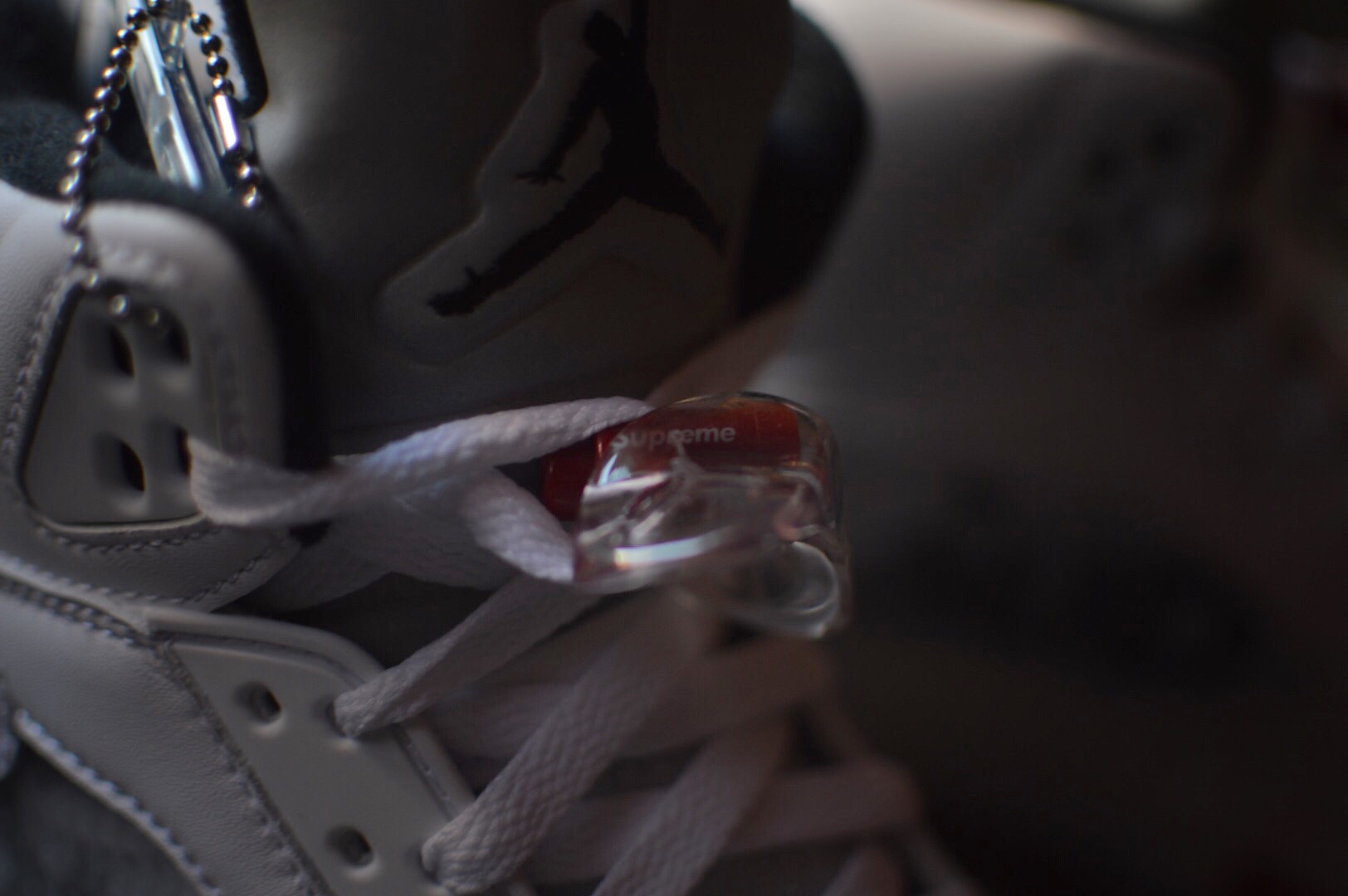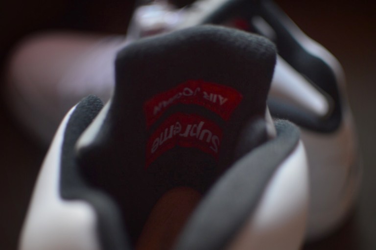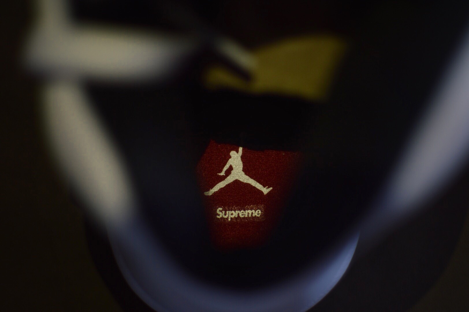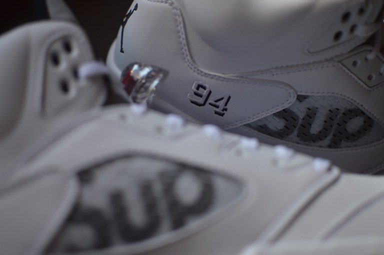 Getting into the details that stand alone from other 5’s; I gotta say my favourite is the Supreme branded lace locks, I would probably buy them separately if they found their way onto the accessories page with the rest of the random Supreme goodies. A 94 replaces the 23 on the side of the heel, and the box logo running parallel to the Air Jordan tag inside the tongue was another touch I liked, as well as the the co-branded insole and hang tag. I don’t love the ‘Sup’ branding on the side panel, personally I would’ve liked a full ‘Sup’ and ’eme’ on alternate sides a lot more, but hey I’m just some dude and it is what it is.
