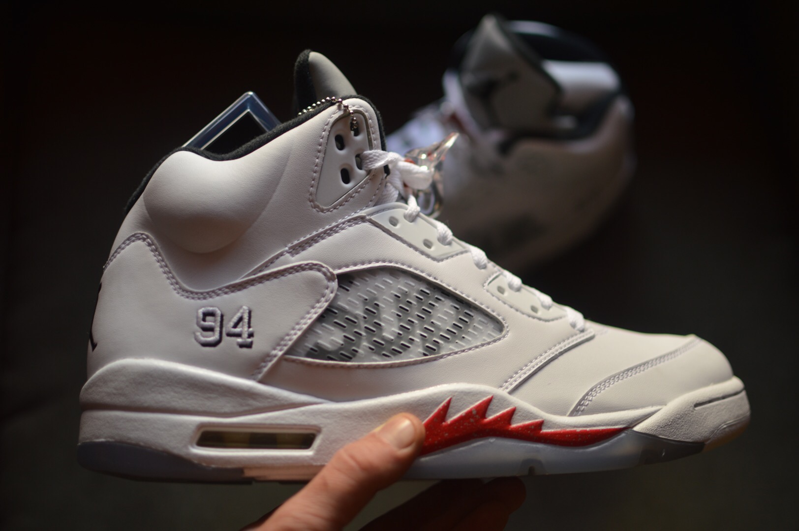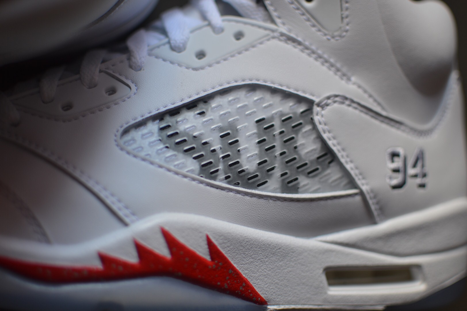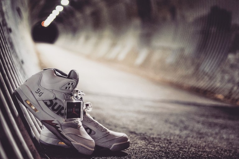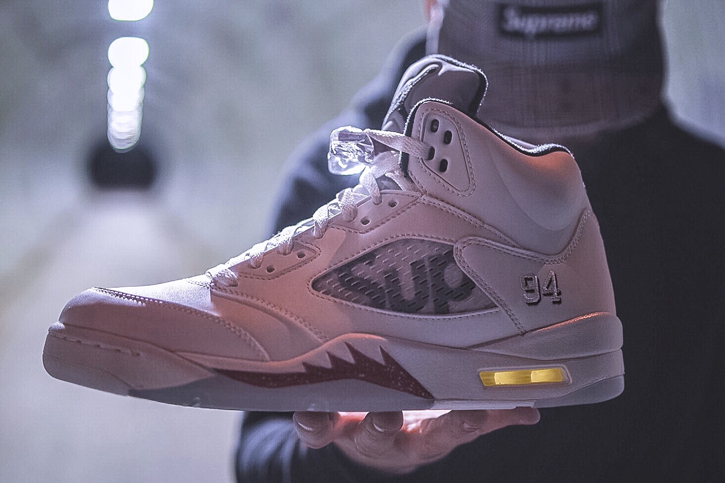 Getting into the details that stand alone from other 5’s; I gotta say my favourite is the Supreme branded lace locks, I would probably buy them separately if they found their way onto the accessories page with the rest of the random Supreme goodies. A 94 replaces the 23 on the side of the heel, and the box logo running parallel to the Air Jordan tag inside the tongue was another touch I liked, as well as the the co-branded insole and hang tag. I don’t love the ‘Sup’ branding on the side panel, personally I would’ve liked a full ‘Sup’ and ’eme’ on alternate sides a lot more, but hey I’m just some dude and it is what it is.