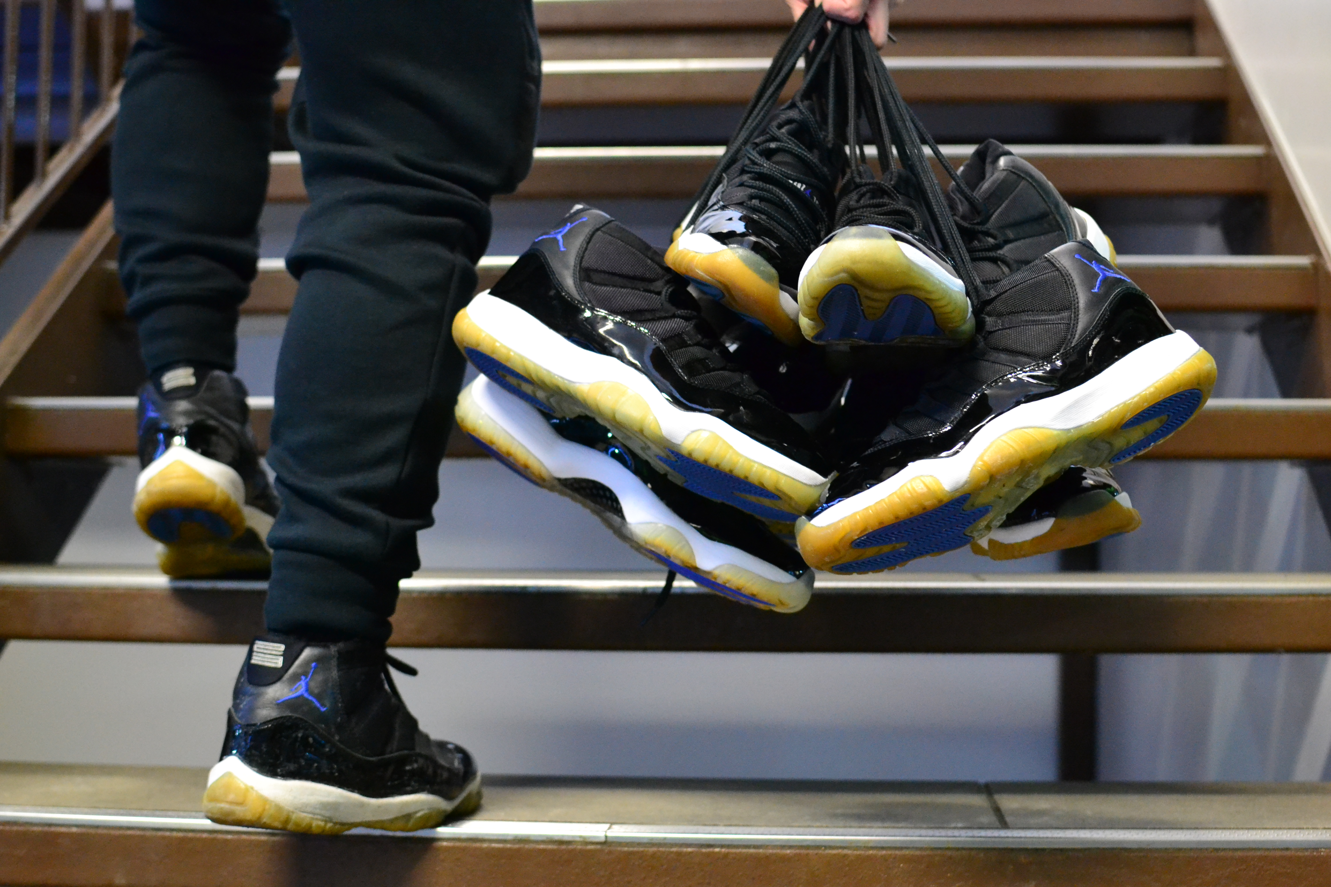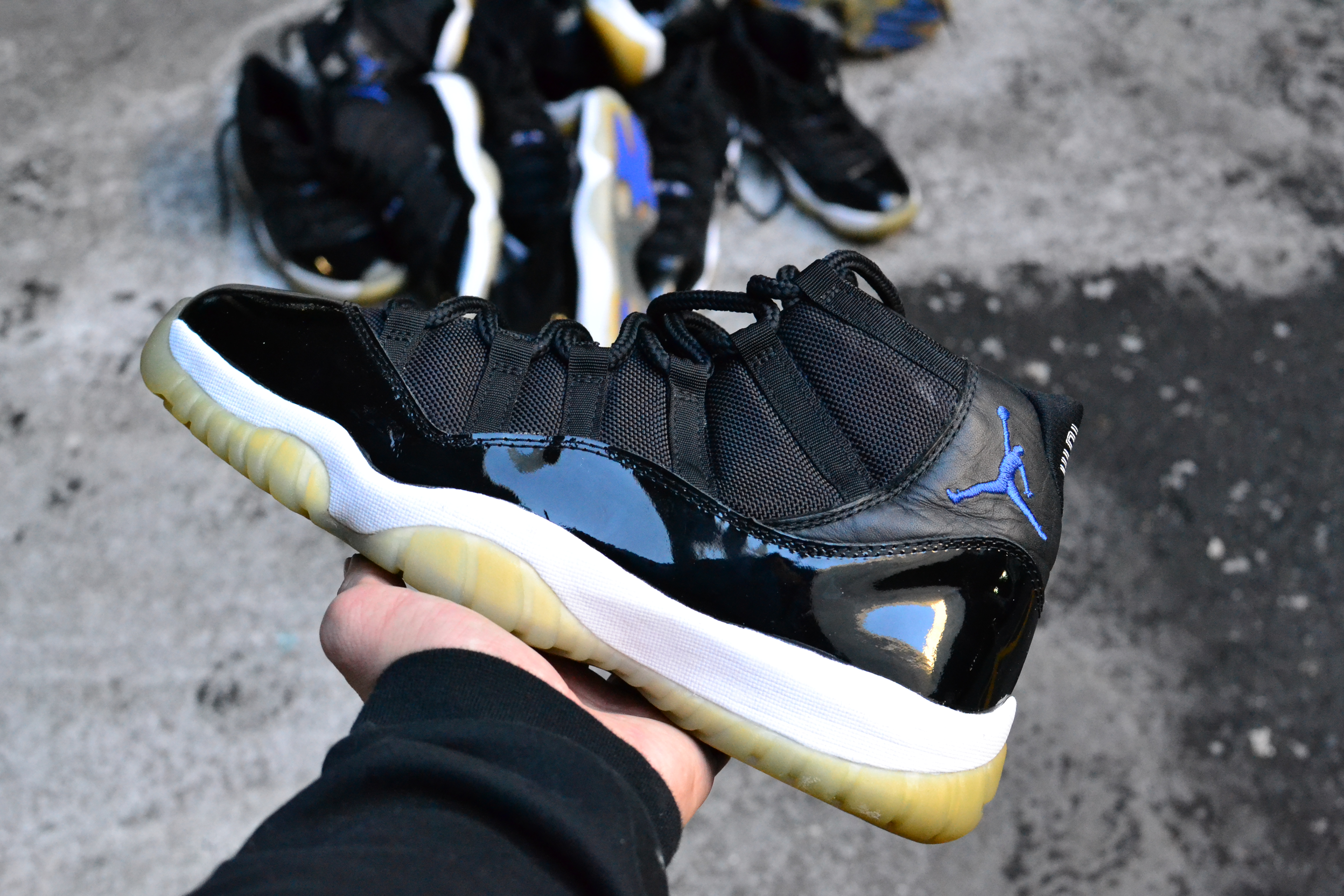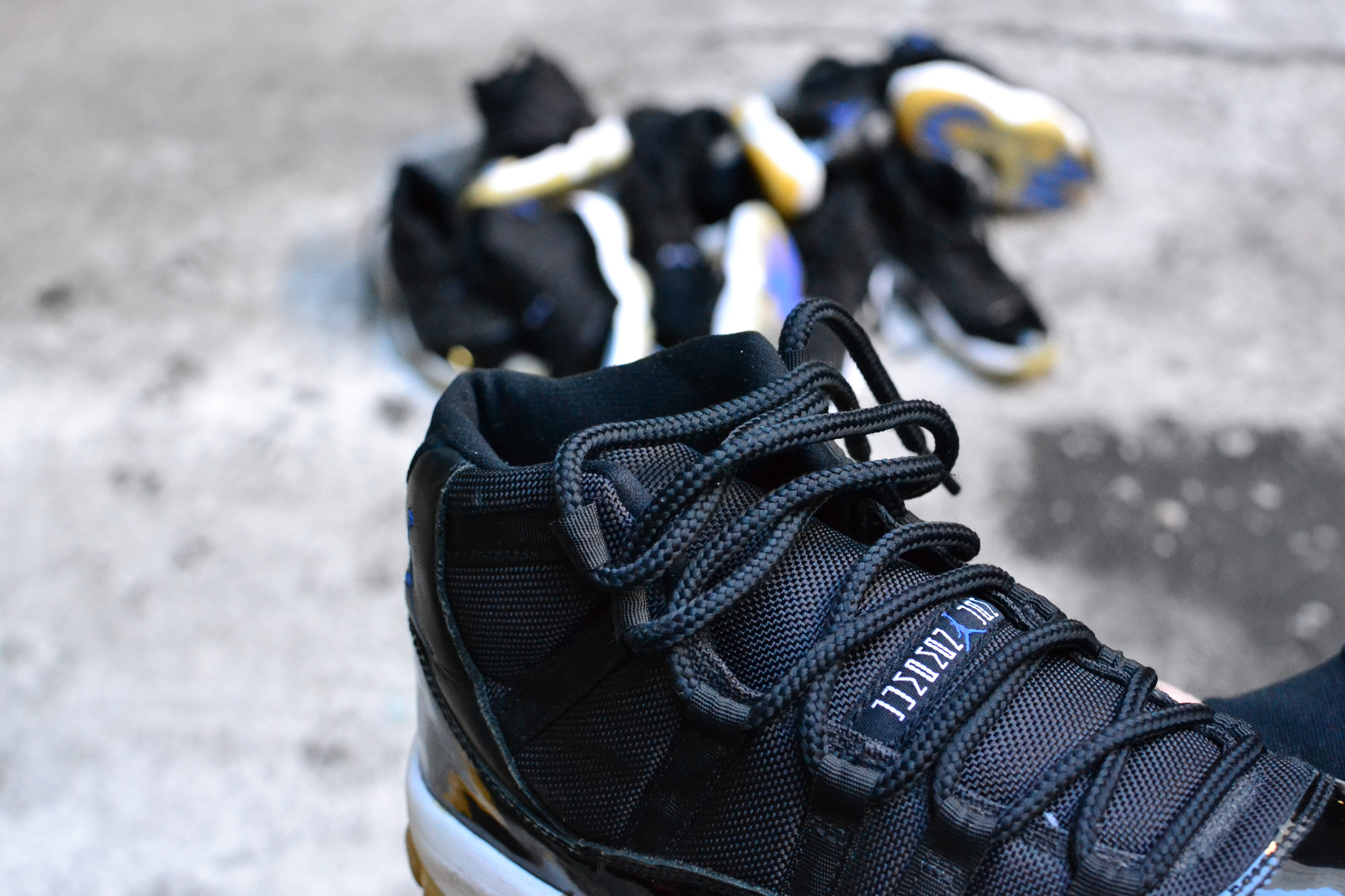 Since the announcement though, I’ve fallen back into the entitled feeling that the Space Jam is mine. It has always been mine. Mine, from that first time winning that auction on eBay, getting them in the mail, lacing them up, and hitting up basketball practice. I was un-containable that day. I don’t actually remember what happened during practice, but I remember looking down at my feet and seeing that hit of blue, peering from that cloak of black patent leather and mesh. I had found my no. 1, but I didn’t quite fully know it yet. It wasn’t until 2010 that I got really involved in sneakers and sneaker forums. I found myself buying pair after pair of the 2000 and 2009 versions of the same shoe. In different states of worn, yellow soled; every pair was singular in its beauty and importance. “You are the pair I will wear through any type of weather… Your sacrifice will be remembered” is what I would insanely say to my Jams.