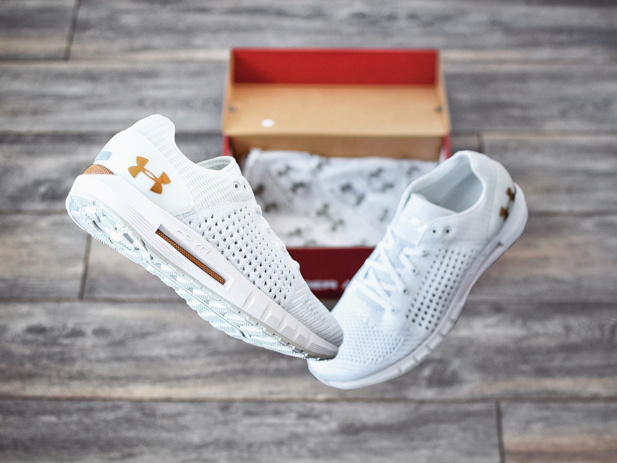 On the heels of our recent parade with the Under Armour HOVR Phantom, the Brag crew was able to take a closer look at the HOVR Sonic. Sporting a low cut collar and, this tightly knit upper is extremely light and supportive. Presented to us in a clean white colourway dashed with hits of gold trimming and logos, the Sonic’s most notable feature is the peak cushioning system that provides comfort and keeps your legs fresh for any footwork down the line.